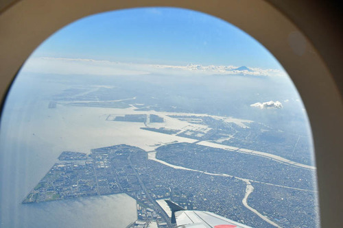 遠くに富士山、手前の埋立地は浦安の東京ディズニーリゾート付近。