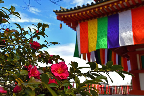 高幡不動尊の五重塔まわりで咲いていた山茶花。
