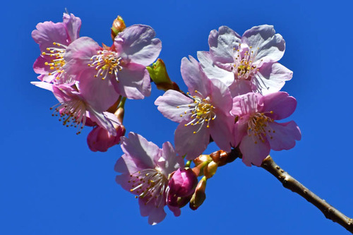 きれいな青空は背景にピンクの河津桜がきれいに咲いている。