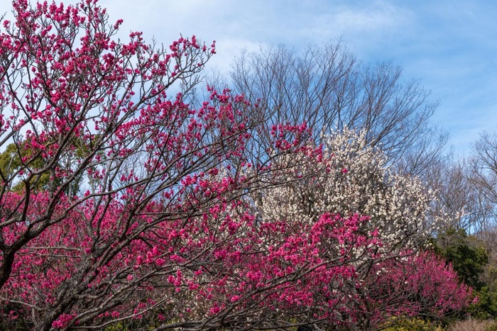白梅の八重野梅、紅梅のエンオウ(鴛鴦)など早咲きの梅を中心に見頃になってきている。