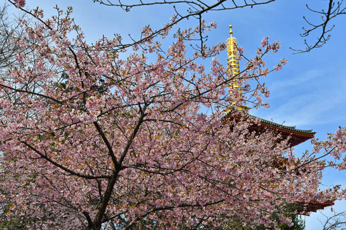 五重塔の横で咲く大きなサンシュユの木。日野市の指定天然記念物になっている。