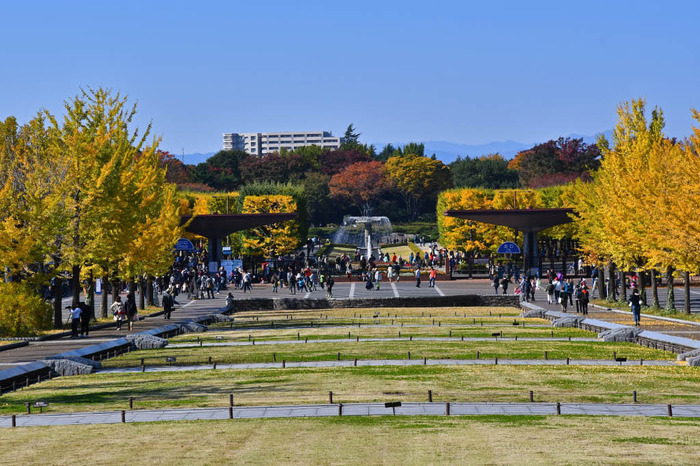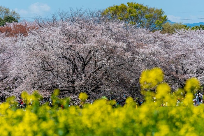 4月に入って2回目の週末。昭和記念公園のみんなの原っぱ東花畑の菜の花とその奥の桜の園の様子。