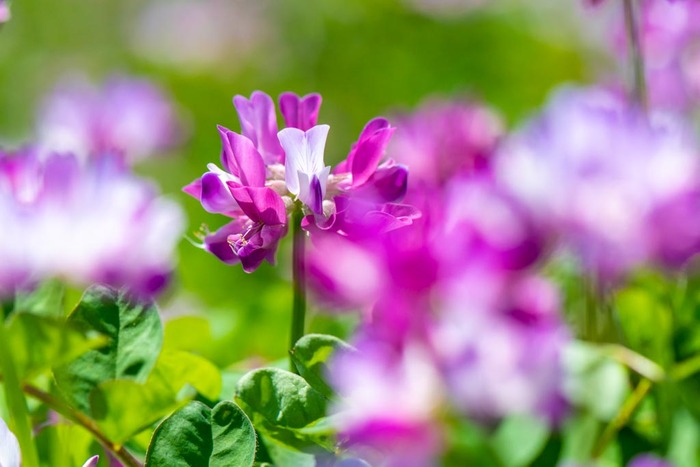 レンゲソウ(蓮華草)、マメ科。花を見るとマメ科らしい形をしているが、花全体の形が蓮の花に似ているから蓮華という名前がついた。