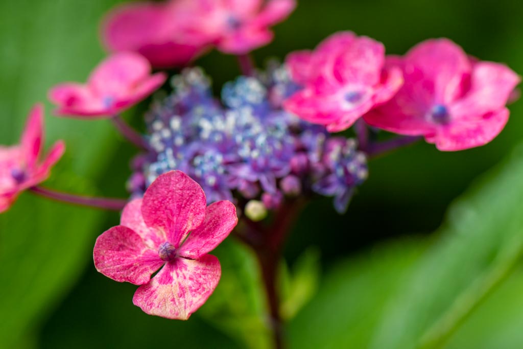 もともと高幡不動尊は青色系のアジサイが多いが、特にこのあたりのアジサイはほとんど青色でたまに薄い赤紫色がある感じ。そんな中でこの西洋アジサイだけ濃紅色。