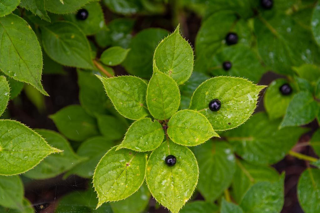 これも変わった植物、葉っぱの真ん中で実がなっている、ハナイカダ(花筏)、ミズキ科。花が咲いていたときの様子が撮れなかったのが残念なので、昨年4月末に撮った写真が以下。葉の真ん中で小さな緑色の花が咲いている。いまはもう花は黒い実になっていた・・・