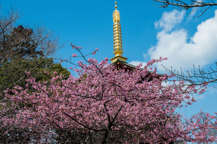五重塔は不動堂の反対側に行くと手前にアジサイがある風景を見ることができる。