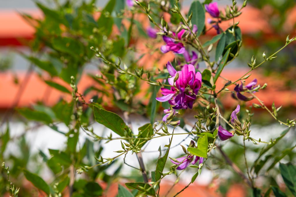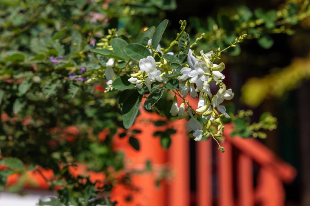 奥殿の横で咲く秋の七草のハギ(萩)、マメ科。昔から日本人に親しまれている花で「万葉集」で最もよく詠まれている花でもある。同じ場所で白花の品種も咲いている。