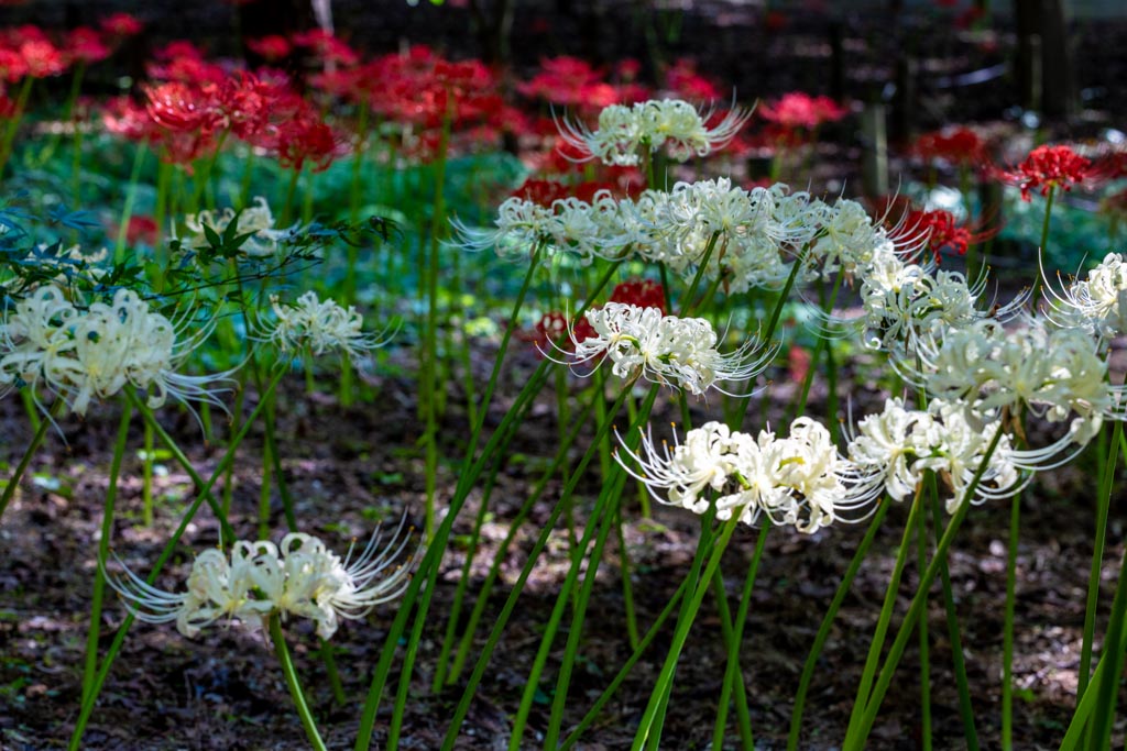 高幡城馬場跡の彼岸花の植栽地の様子。全体的にまばらな咲き具合。まだ蕾もあるので、開花が例年より遅れている感じ。多くはないけど白花も咲いている。以前は黄色の彼岸花(鍾馗水仙)も咲いていたけどこの日は見ることができなかった。
