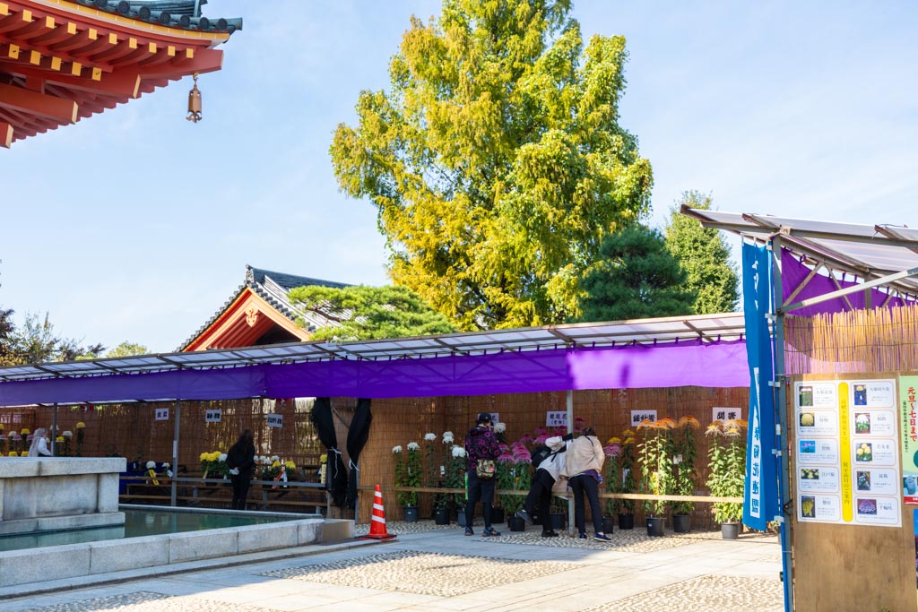 今年は境内奥の客殿建替え工事の関係で五重塔周りだけになっている菊まつり会場。