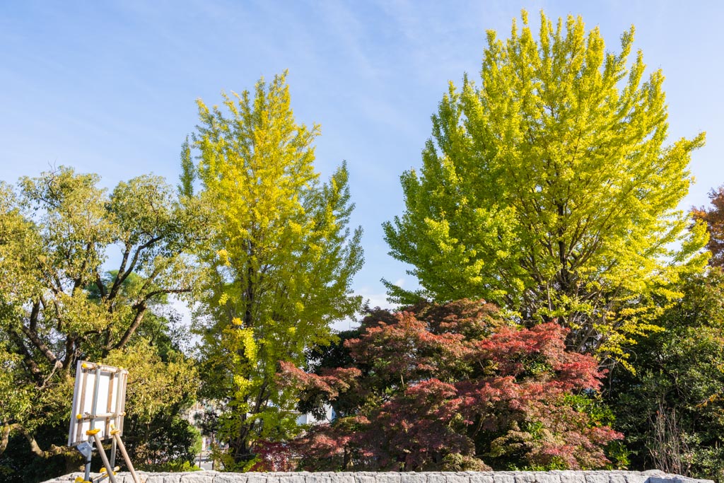 五重塔正面の2本のイチョウ。黄葉の見頃にはまだもう少し先。