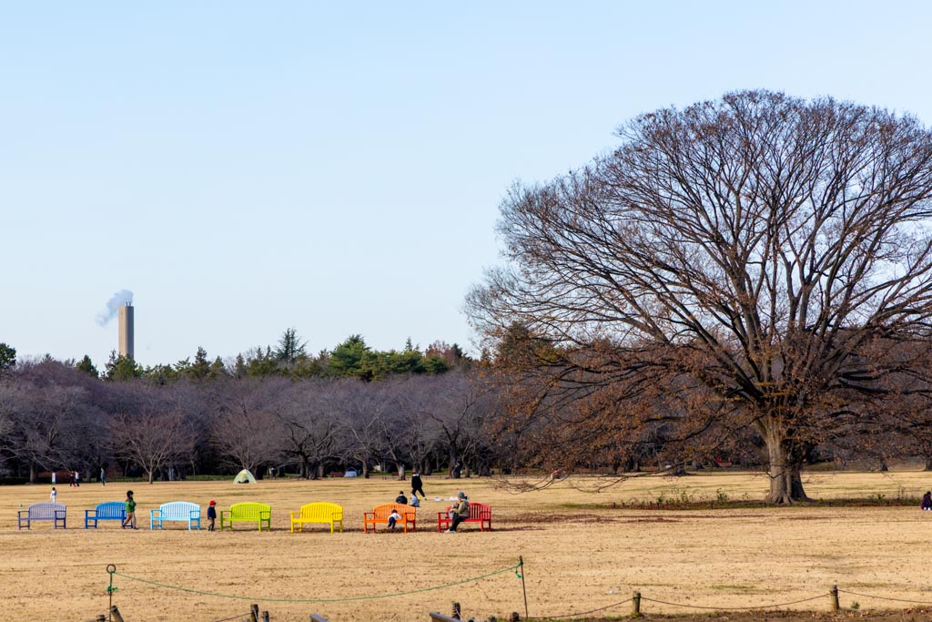 みんなの原っぱは冬景色、7色のベンチが置かれていた。