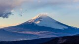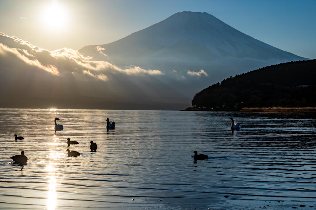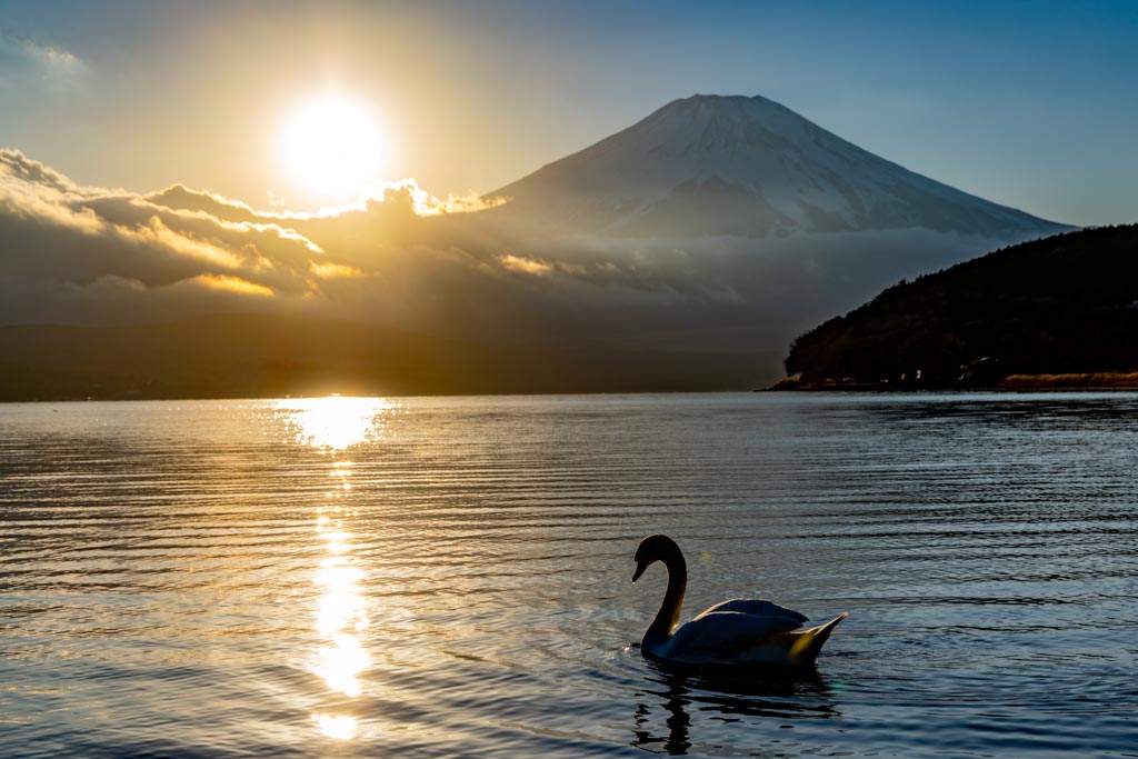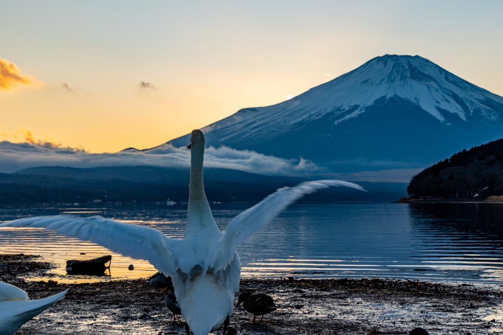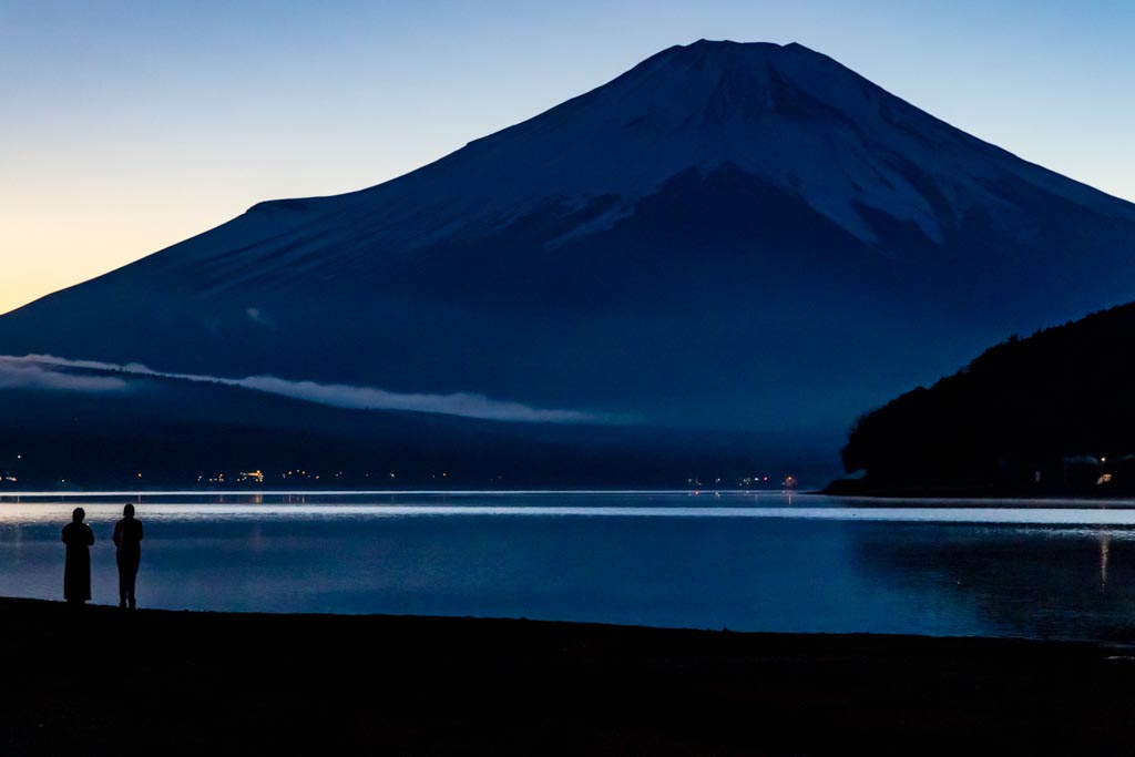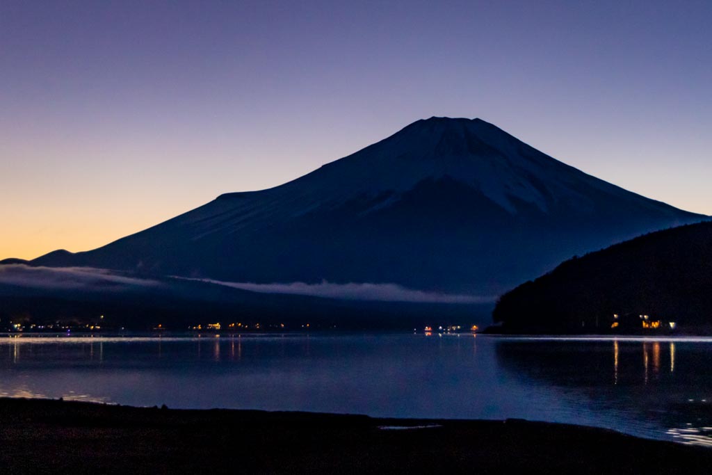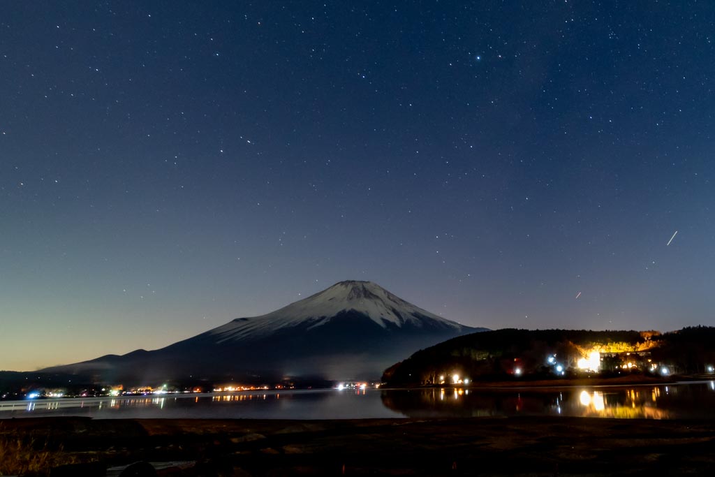 山中湖の平野の浜からの富士山。今回は夕陽が沈む頃(夕景)から沈んだ後の星空(星景)まで。