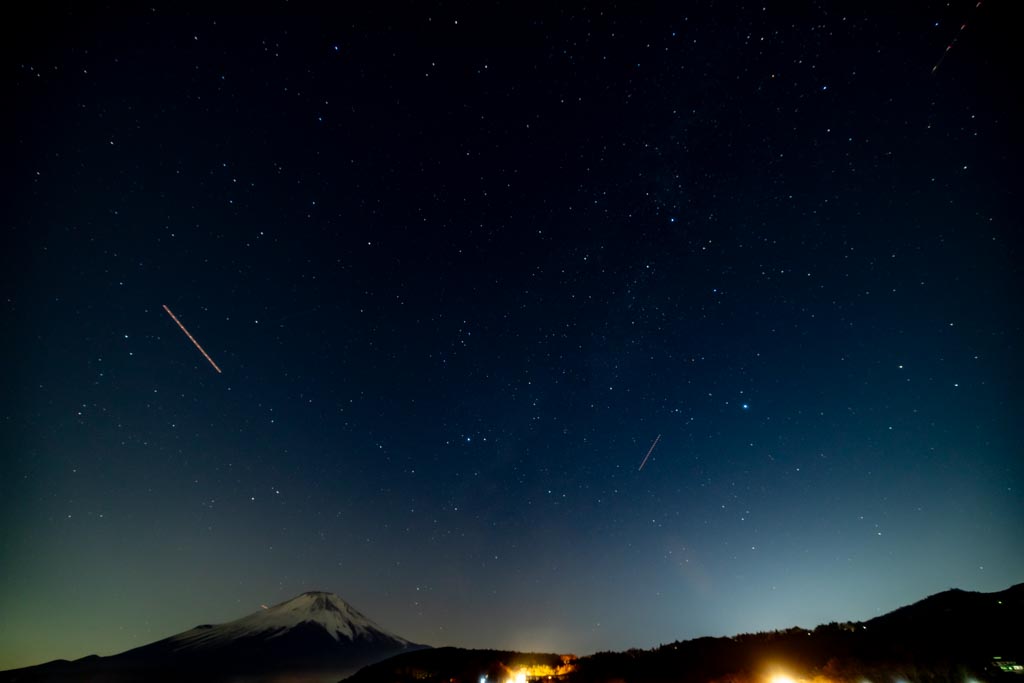 拡大して見ると光の筋ではなく点々のつながりになっている。富士山の周りは航空機の飛行ルートになっているので肉眼でもたくさん飛行機が飛んでいるのが見えた。