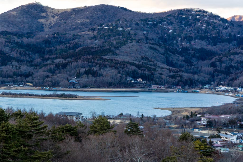 ここは山中湖畔を走る国道413号を平野から山側に入って山を登ってくる場所。下写真が山中湖の東端、湖畔の突き出た部分が以前朝焼けの富士山を撮った平野の浜。