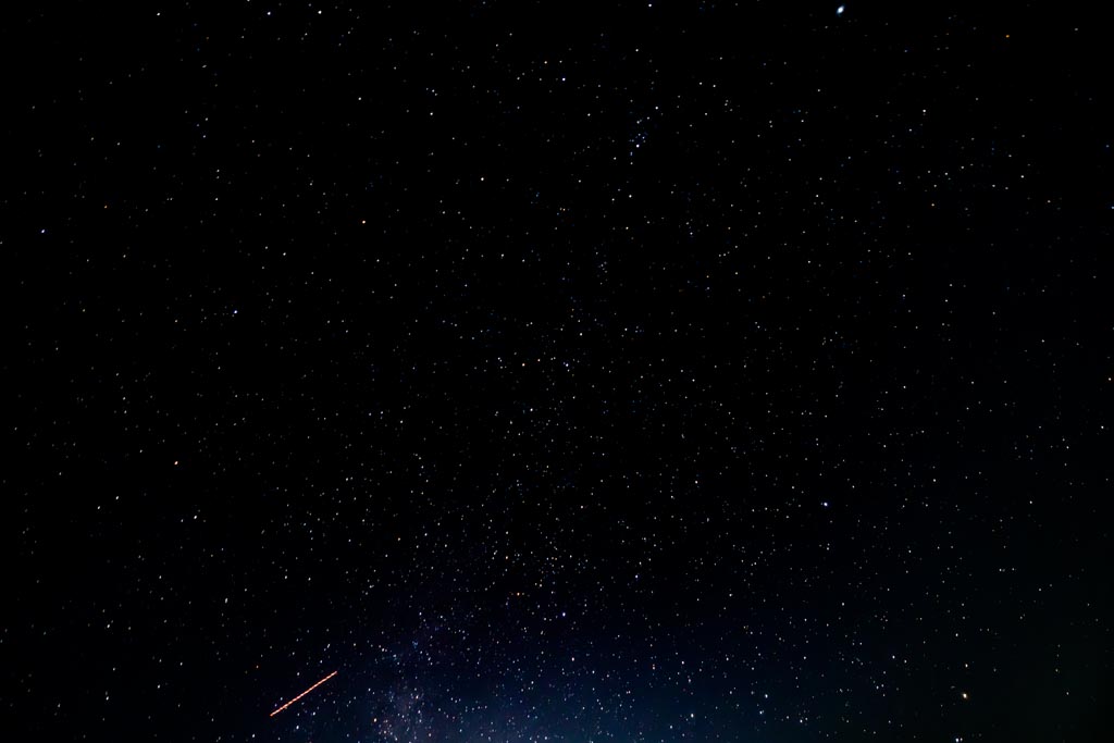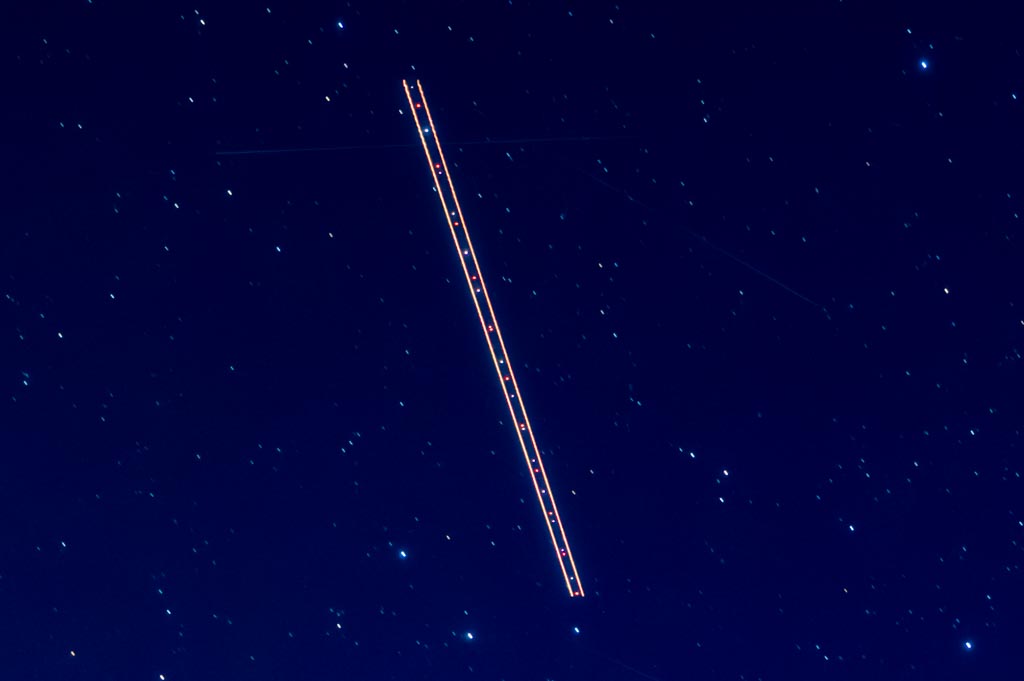 航空機の航行灯が点々と映っているのがわかる。これは流れ星ではない。