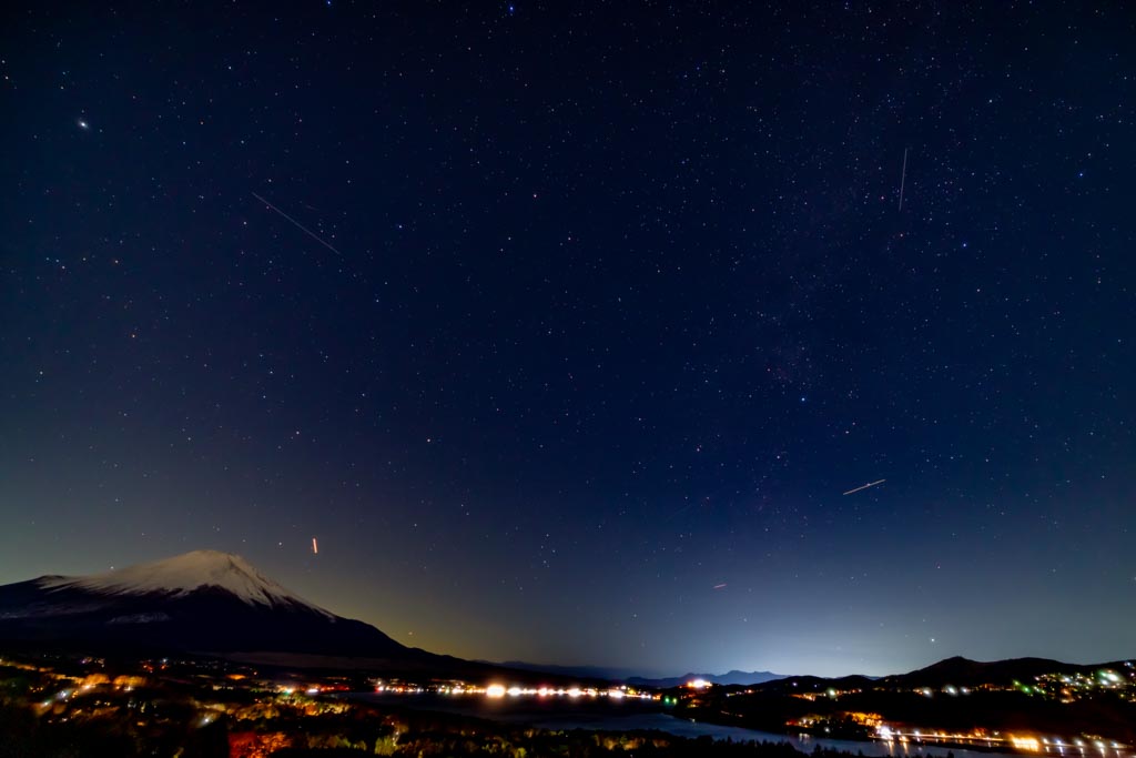暗くなるまで車の中で待って星景写真に挑戦。街の明かりが山中湖畔に光る。