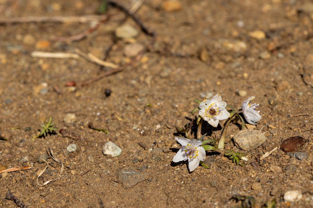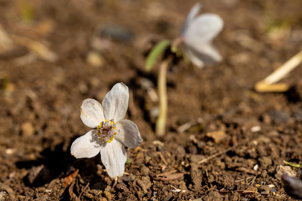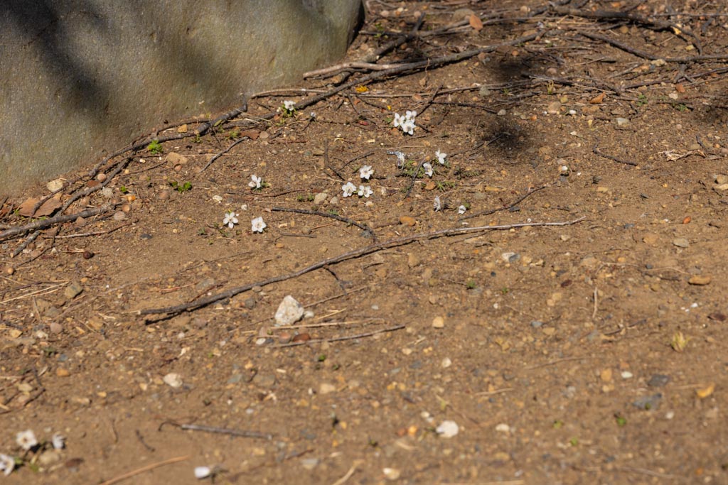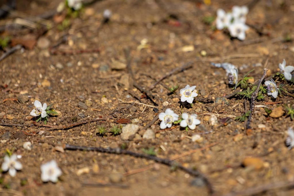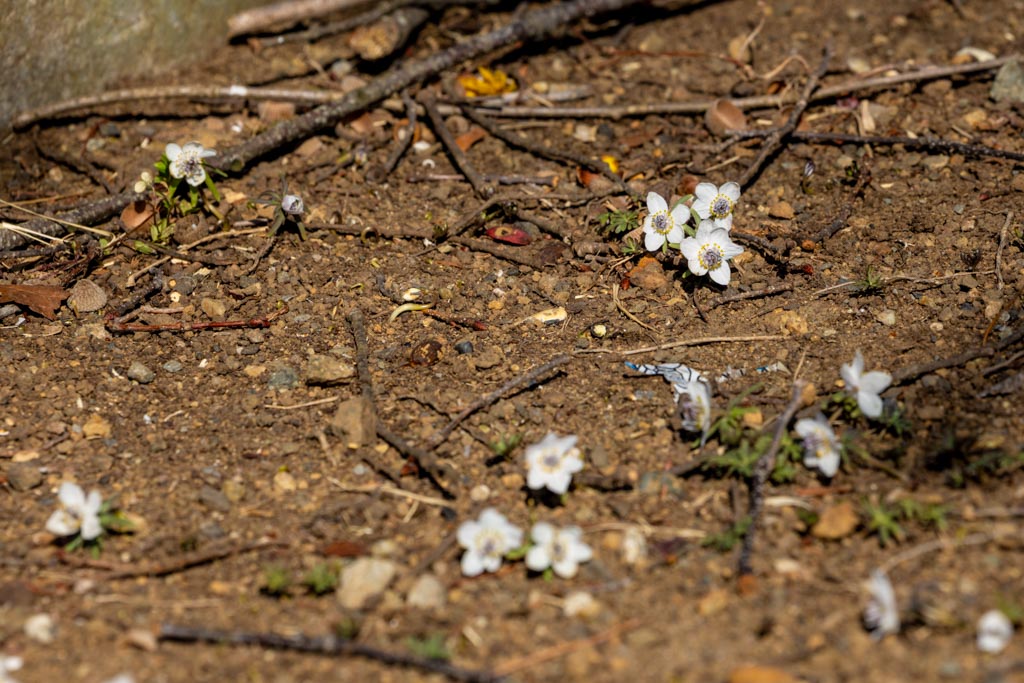 節分草(セツブンソウ)、キンポウゲ科。日本の固有種で早春に芽を出し節分の頃に花を咲かせることからつけられた名前。昭和記念公園では節分の前に開花するけど、これだけの数がしっかり咲くのはやはり節分の頃になる。花は小さくて2cmぐらい。すぐ横に茶色どんぐりのようなものがあるので、それと比較して大きさがわかると思う。