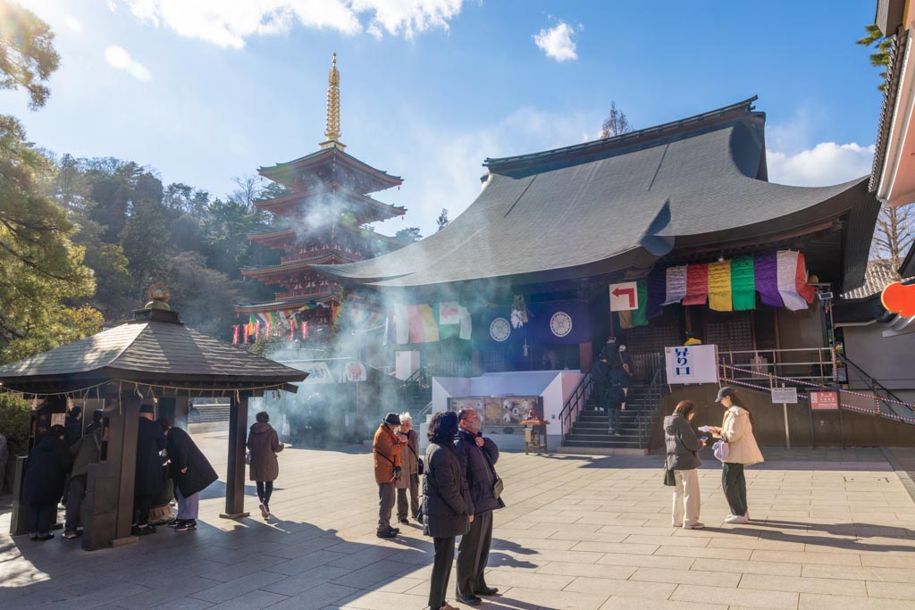 高幡不動尊の境内、不動堂はまだお正月仕様で参拝者もわりと多い。