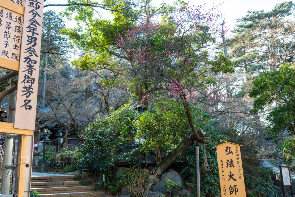 弘法大師像上の紅梅もかなり咲いている。