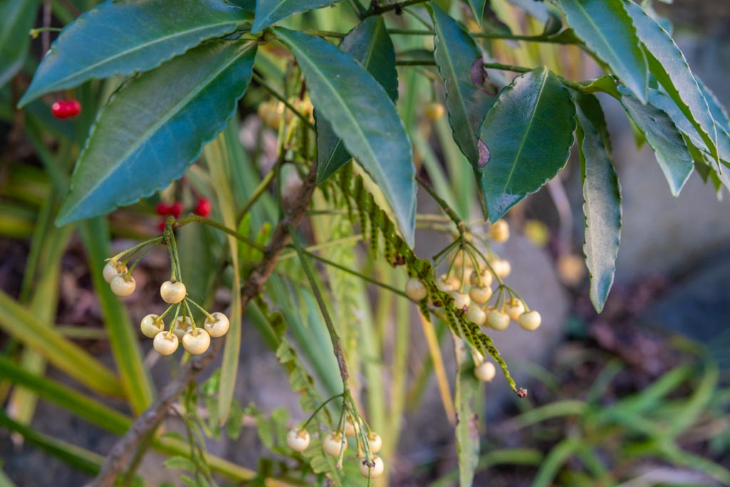 この紅梅の足元で見つけた白いマンリョウ、シロミノマンリョウ(白実万両)、ヤブコウジ科。