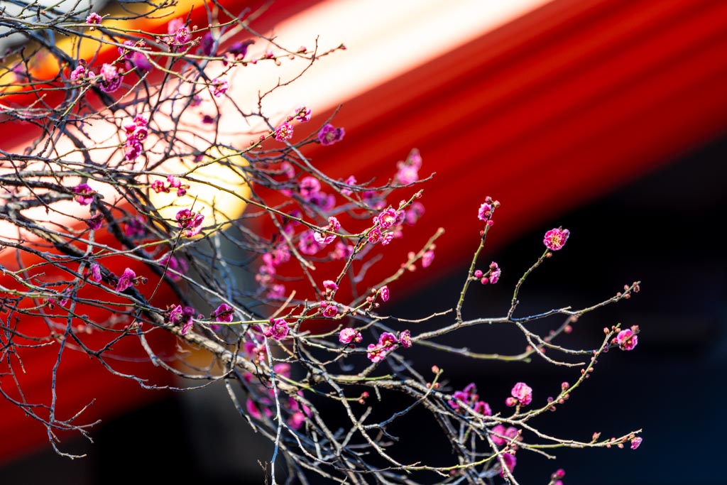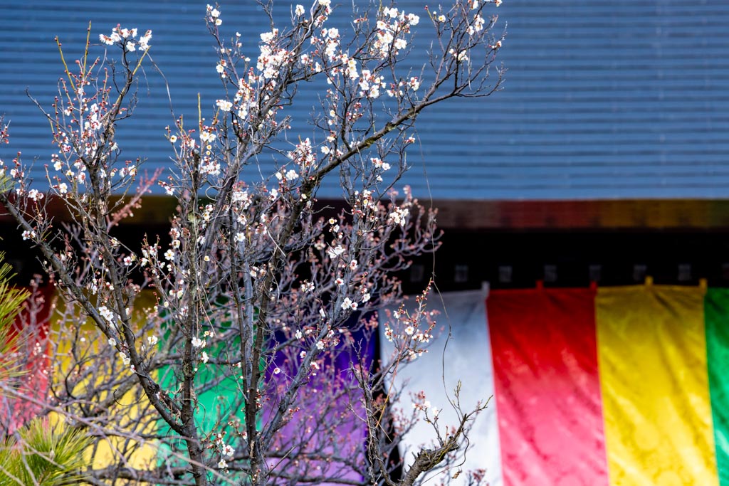 弘法大師像上の紅梅。