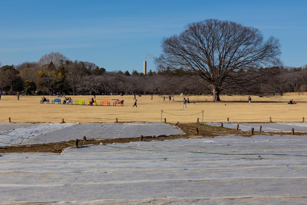 みんなの原っぱ南花畑は次の花たちのための準備中で養生シートが敷かれている。