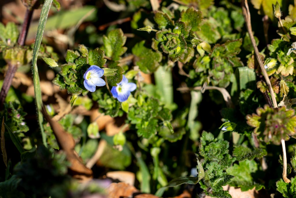 菜の花畑の周りで咲く春の花。オオイヌノフグリ、オオバコ科。小さいけど群れて咲くとすごくきれい。