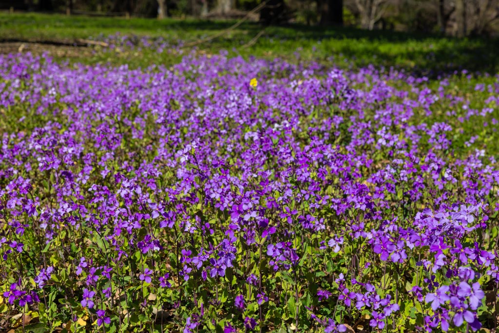 みんなの原っぱの端のほうで咲いていたオオアラセイトウ(大紫羅欄花)、アブラナ科。紫色の菜の花という意味で別名ムラサキハナナ(紫花菜)とも呼ばれる。