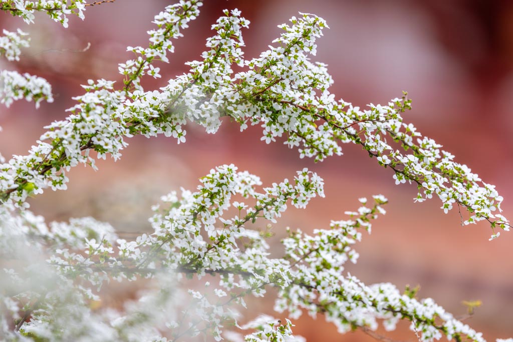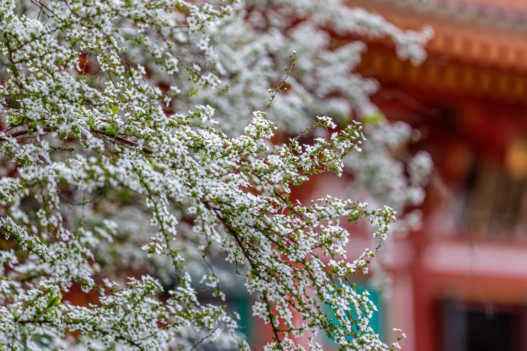 五重塔横で咲くユキヤナギ(雪柳)、バラ科。