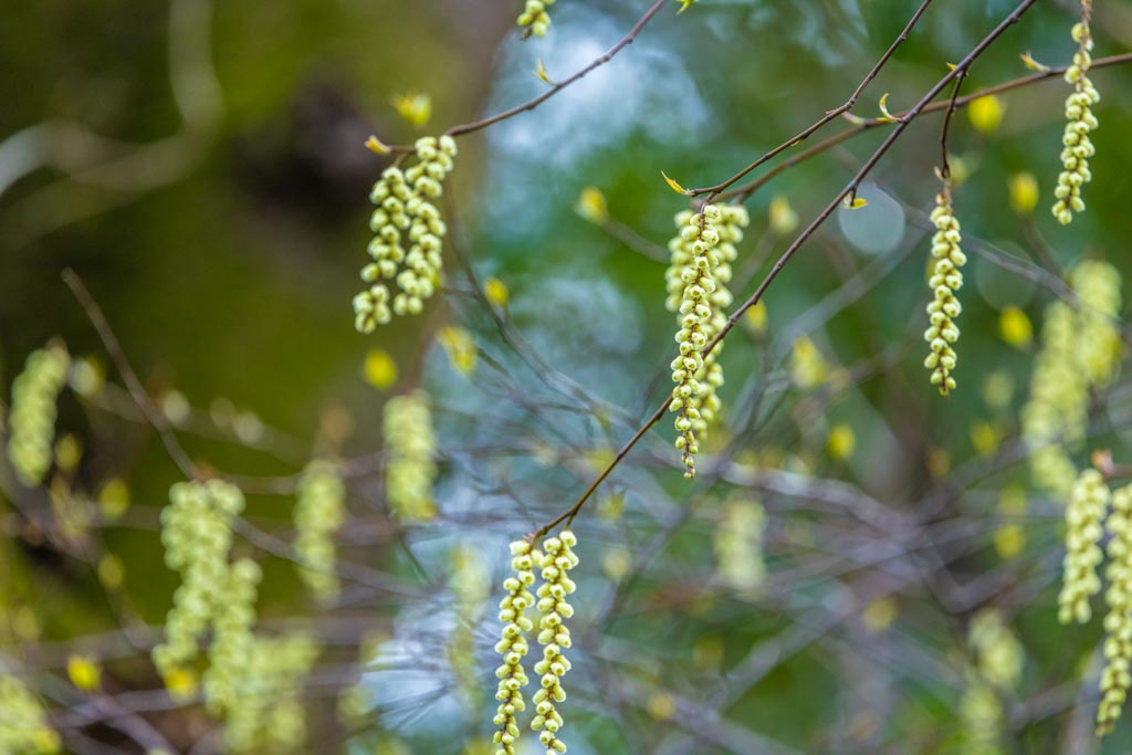 淡い黄色の小さな釣鐘型の花がブドウの房のように垂れ下がっている。