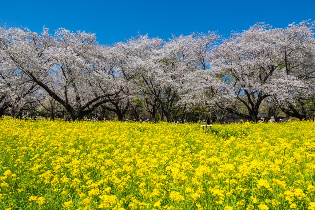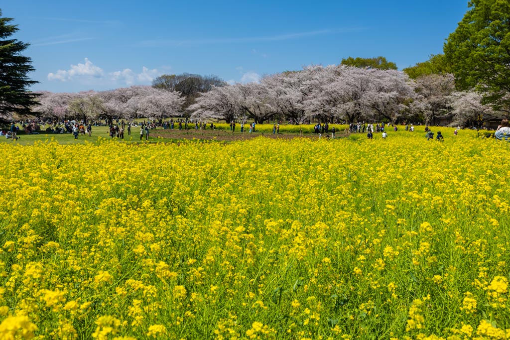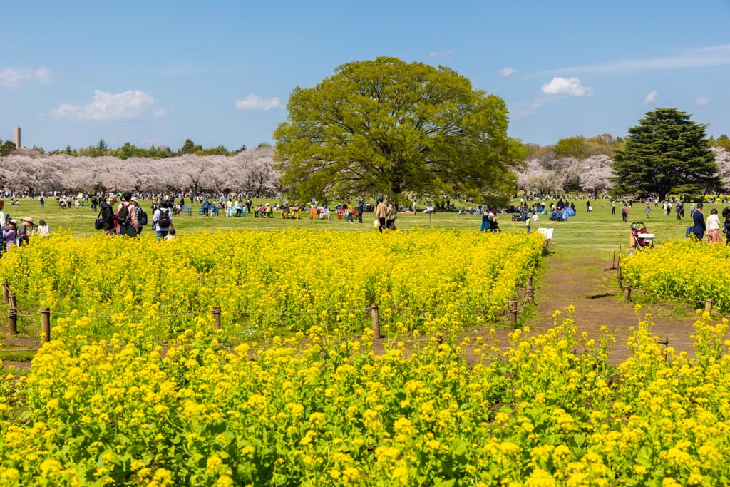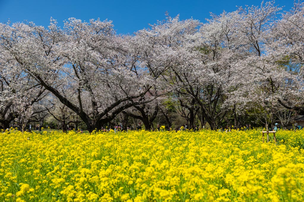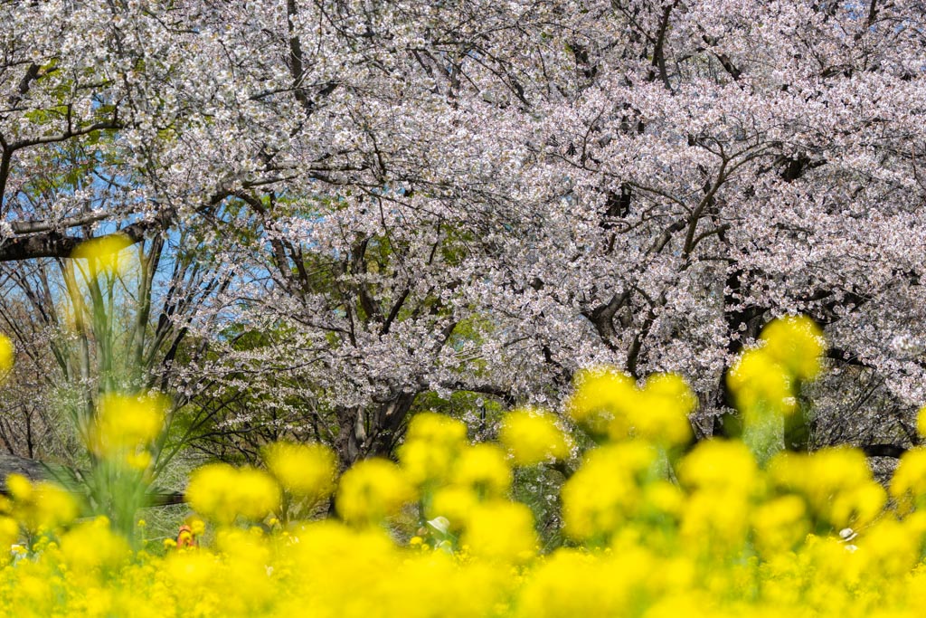 桜の園の端はみんなの原っぱ東花畑の前になるので、そこで桜の園のソメイヨシノと東花畑の菜の花のコラボレーションを見ることができた。