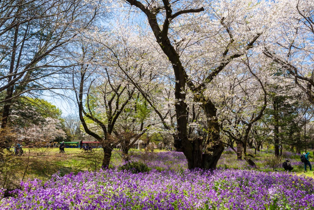 昭和記念公園の桜は単体でも楽しめるが、東花畑の菜の花のように他の春の花と重ね合わせた景観も楽しめるようになっている。ここは桜とムラサキハナナが楽しめる場所。