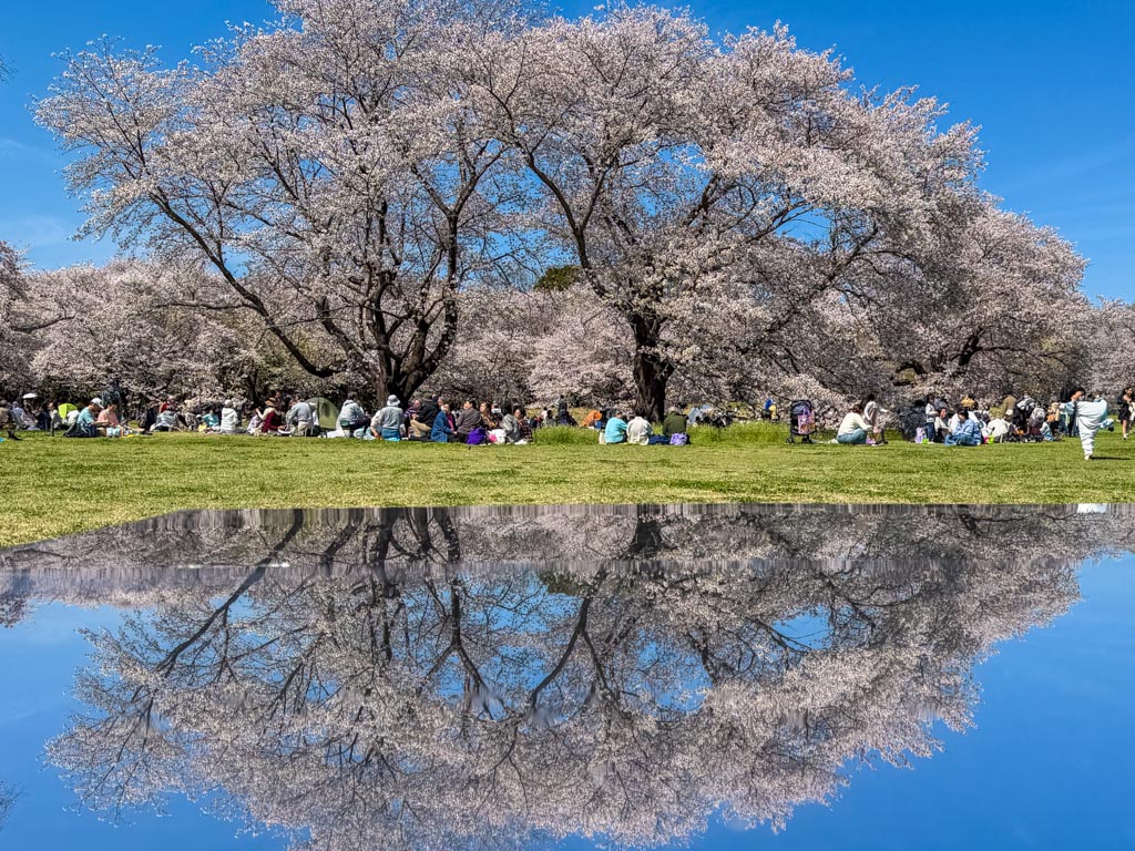 桜の園にもフォトスポットとしてリフレクションボードが置かれていた。桜も満開、天気も良くて人は多かったけど最高のお花見になった。