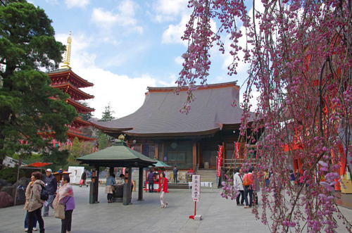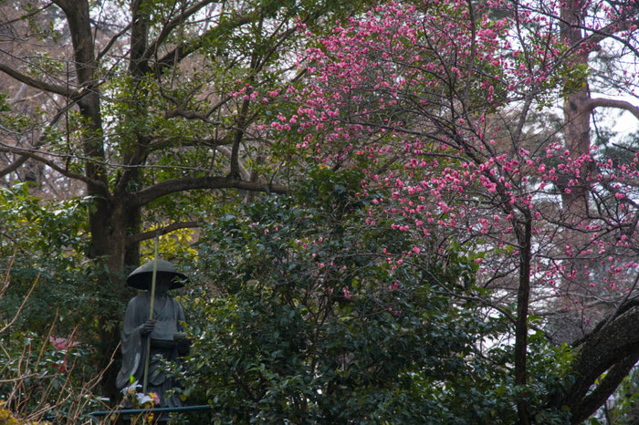 弘法大師像の前の紅梅はかなり咲いてきた。節分の前になると、この場所に「節分会年男参加者」の掲示板が出る。