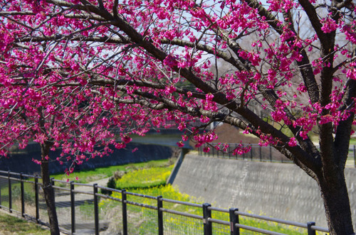 桃色が濃い桜、寒緋桜(カンヒザクラ)が見頃。背景には菜の花が見える、ちょっと春らしい景色