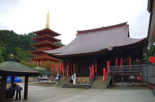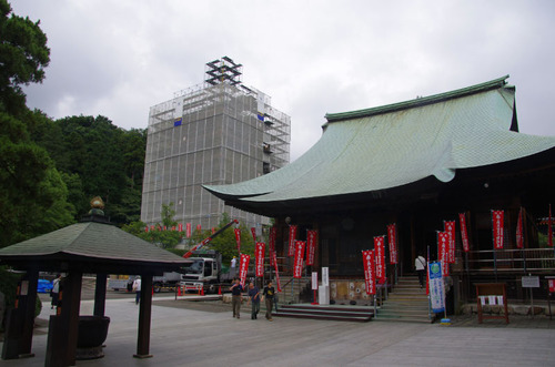 アジサイの花だけでなく、五重塔も工事用ネットで見ることができない。