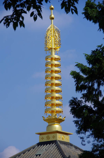 五重塔の先端に何も飾りがない状態。避雷針が見える
