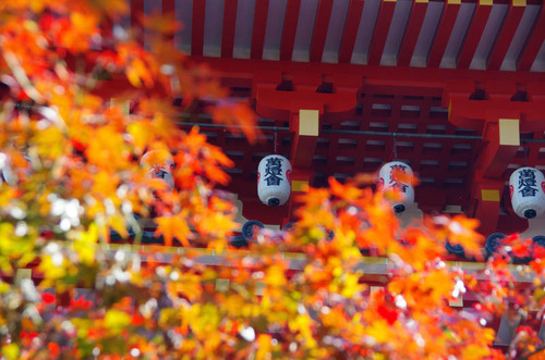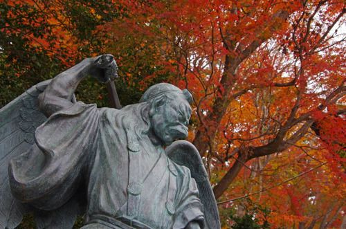 11月下旬の高尾山といえば紅葉。薬王院四天王門そばの大天狗・小天狗(カラス天狗)像と紅葉の様子。