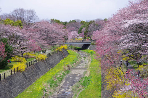 昭和記念公園の桜も咲き始めて春らしい色になっている。これは「ふれあい橋」から園内を流れる残堀川上流方向を見たところ。先に見えるのは「さくら橋」かな。