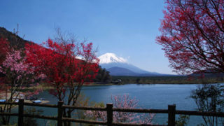 写真 精進湖からの富士山 初めて見る精進湖からの富士山手前が赤やピンクできれいだけど、良く見ると紅葉なの?桜なの?っていう感じちょっとアップにしてみる。邪魔な電柱と電線はないけど、山麓が隠れてしまった派手に紅葉しているのはこのカエデ。これもノムラカエデの仲間なのかな... 2010.05.07 写真日記