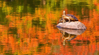 お気に入り写真 紅葉に囲まれた! D500 with AF-S VR NIKKOR 70-300mm f/4.5-5.6G IF-ED 2016.11 昭和記念公園 日本庭園甲羅干しをしているうちに周りを紅葉に囲まれたカメ(笑) 2016.11.05 お気に入り写真秋の風物詩