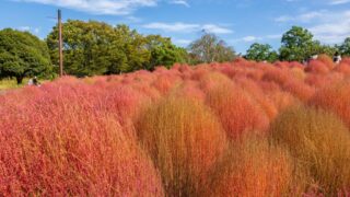 昭和記念公園 昭和記念公園 コキアの紅葉(10/18) 10月18日(土)の昭和記念公園。ハーブの丘のコキアが紅葉見頃になったということなので、箱根駅伝予選会が終わって関係者が少なくなった頃を見計らって行ってみた。立川口カナール両側のイチョウ並木はなんとなく色づき始めた感じ。ハーブの丘に到着。丘の上にはフォトスポットとして白いブランコが置かれている。「白いブランコ」と言えば1969年のビリー・バンバンのデビュー曲、懐かしい。 2025.10.21 昭和記念公園秋の風物詩